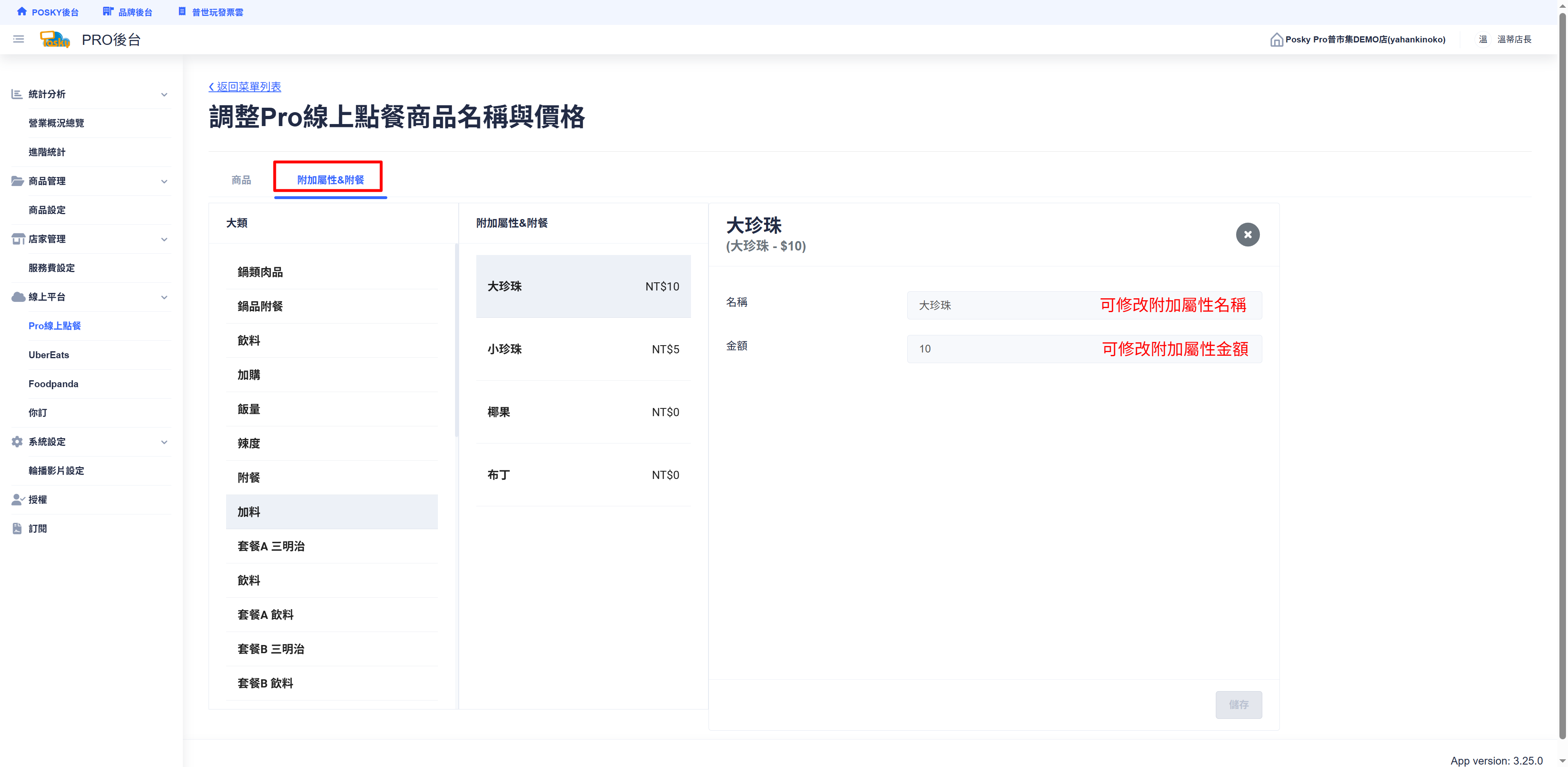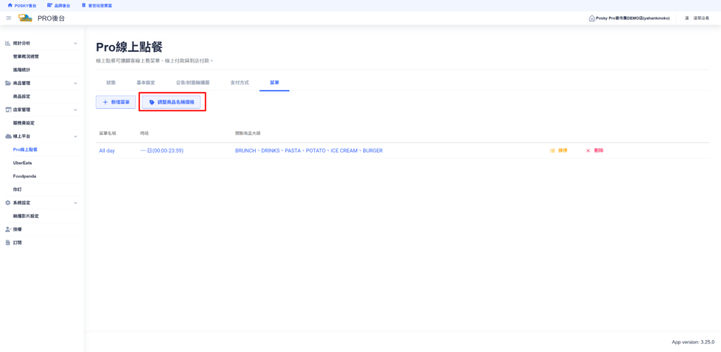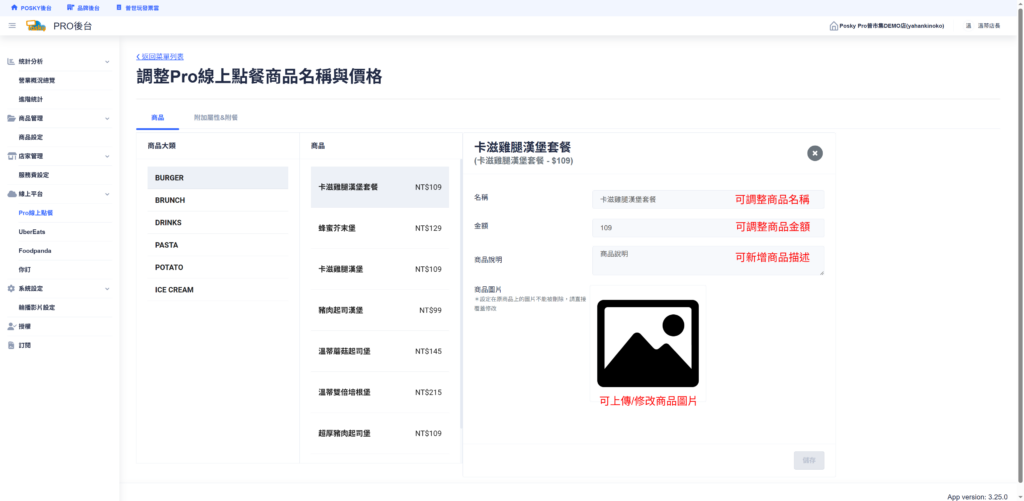 線上點餐PRO_品項說明設定 Step1. 進入【線上平台】> 選擇【線上點餐PRO】> 點選【菜單】 Step2. 點選【調整商品名稱價格】 Step3. 按商品 > 點選該品名,可編輯【品項名稱、價格、說明以及圖片】> 調整完成後按【儲存】 Step4. 按附加屬性&附餐 > 點選該附加屬性,可編輯【名稱、金額】> 調整完成後按【儲存】 Step5. 查看線上點餐頁面,確認是否成功顯示,成功即完成品項說明設定。