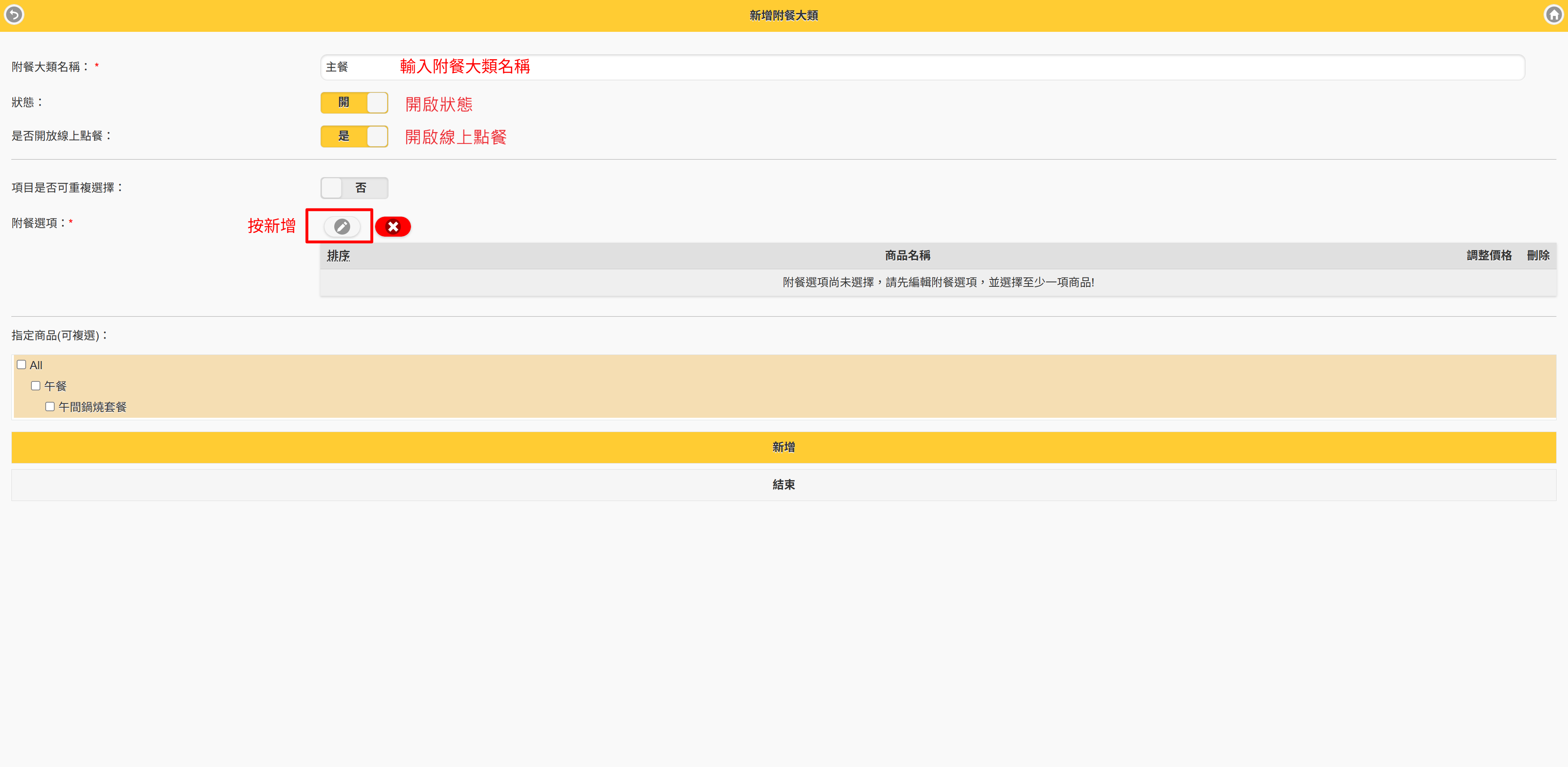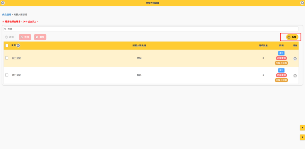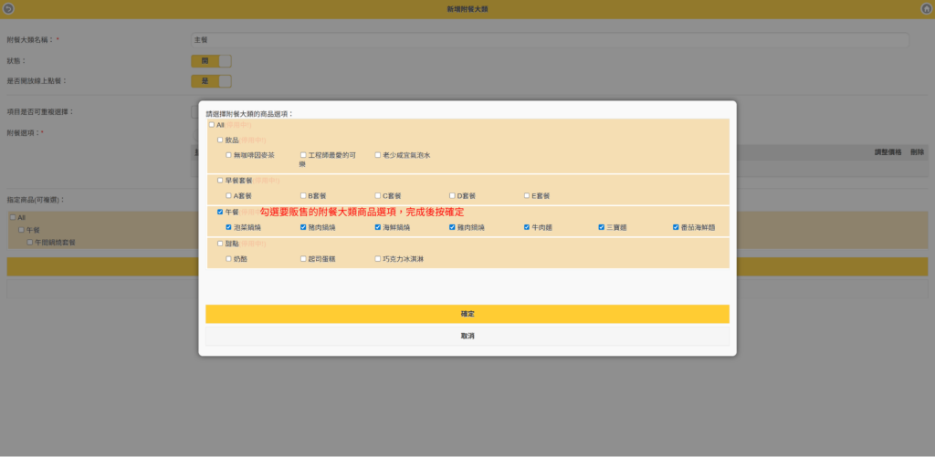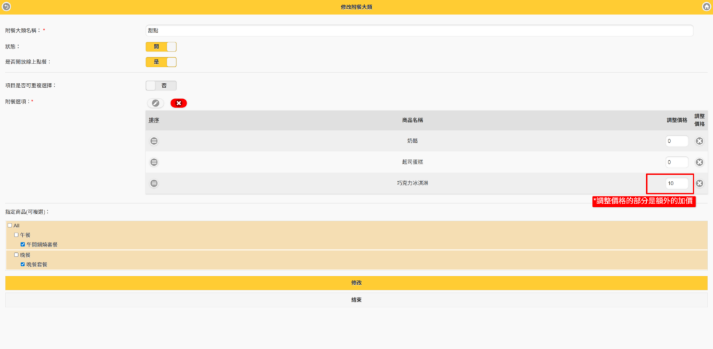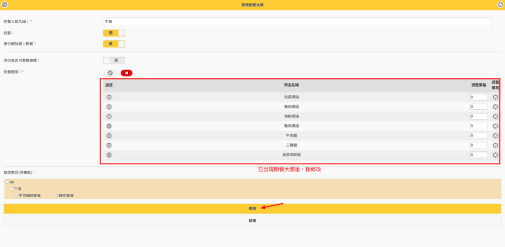 第一步、設定附餐大類管理 #此功能為PRO版使用 #適用1.26.0以上版本 【說明】 在建立套餐的附餐大類之前,需先將所有商品以及附加屬性都建立完成後,再來做設定會更方便喔! Step1.進入商品管理>附餐大類管理 Step2.按【新增】 Step3.輸入相關設定 -輸入附加大類名稱(如:主餐)-開啟狀態-開放線上點餐-是否可重複選擇-附餐選項(按新增) Step4.選擇附餐選項 選擇要在主餐中顯示的附餐大類,選擇完後按確定 Step5.出現附餐選項 確定選擇完成後,按修改 Step6.再依序建立附餐大類 直至您套餐的所有附餐建立完成為止 *小秘訣 針對附餐大類中的商品,如果有額外需要加價的部分,可以在調整價格中輸入加價的金額。如:巧克力冰淇淋需加價$10,則輸入加價的金額$10。 在收銀台點餐時,就會出現加價的金額顯示