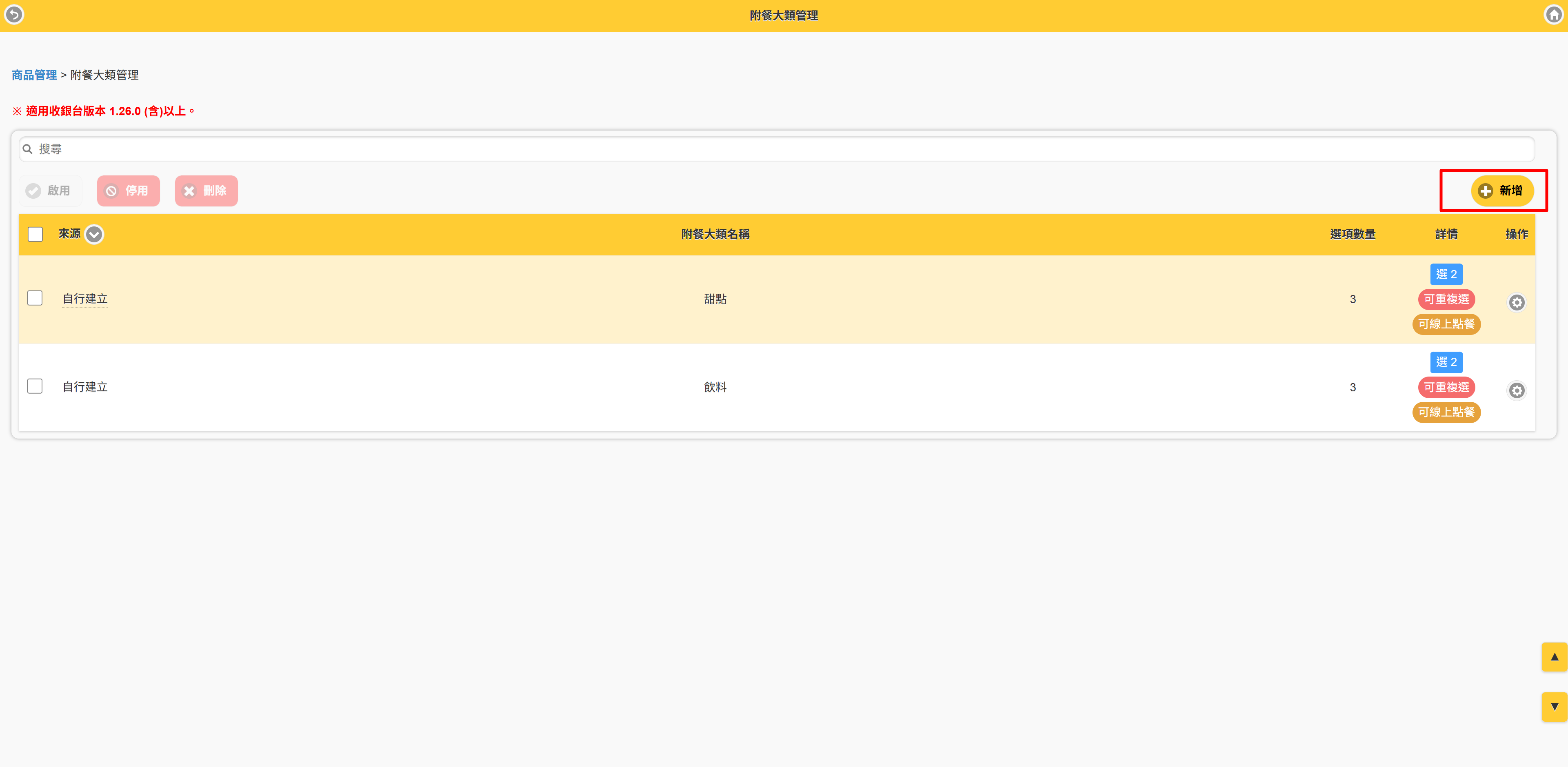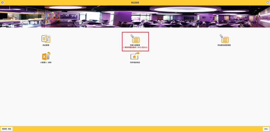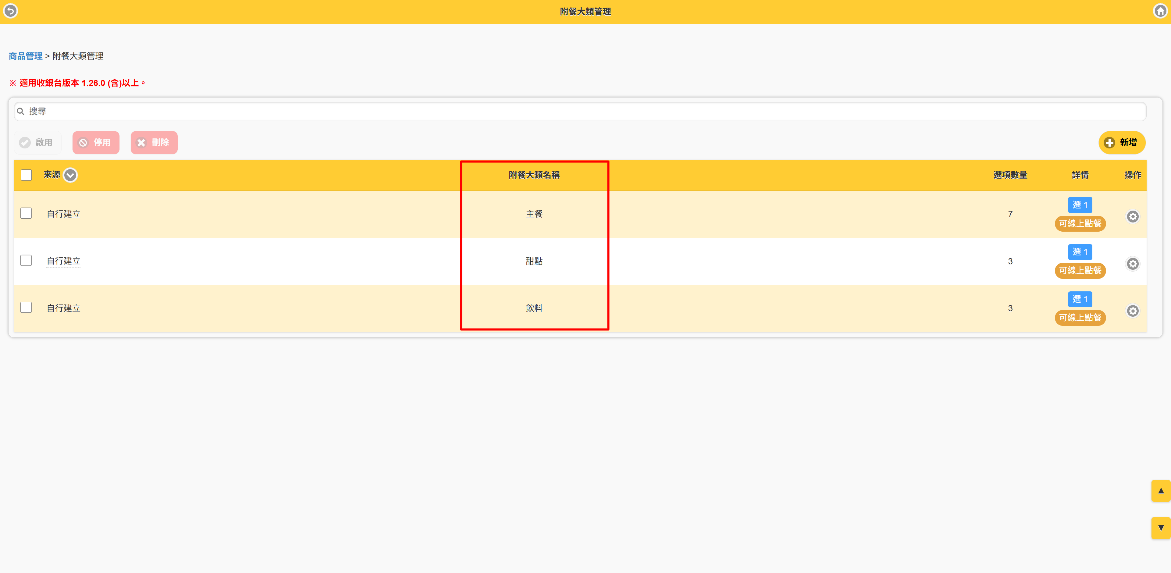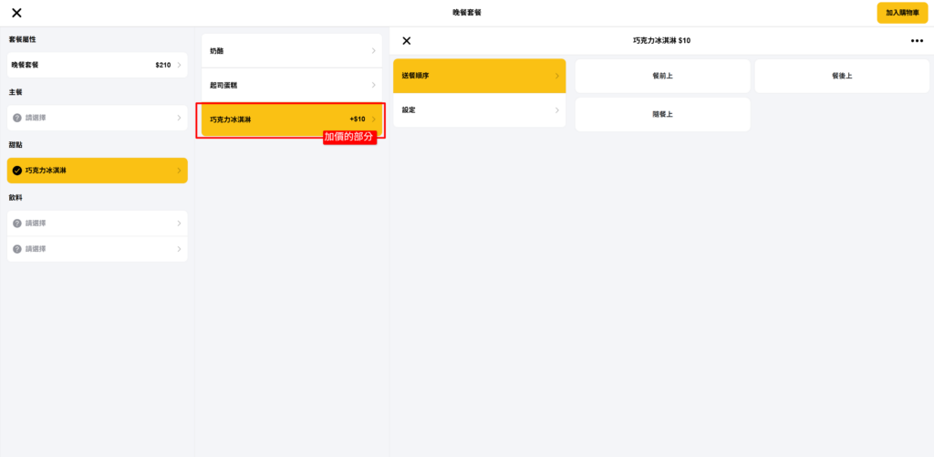 第一步、設定附餐大類管理 #此功能為PRO版使用 #適用1.26.0以上版本 【說明】 在建立套餐的附餐大類之前,需先將所有商品以及附加屬性都建立完成後,再來做設定會更方便喔! Step1.進入商品管理>附餐大類管理 Step2.按【新增】 Step3.輸入相關設定 -輸入附加大類名稱(如:主餐)-開啟狀態-開放線上點餐-是否可重複選擇-附餐選項(按新增) Step4.選擇附餐選項 選擇要在主餐中顯示的附餐大類,選擇完後按確定 Step5.出現附餐選項 確定選擇完成後,按修改 Step6.再依序建立附餐大類 直至您套餐的所有附餐建立完成為止 *小秘訣 針對附餐大類中的商品,如果有額外需要加價的部分,可以在調整價格中輸入加價的金額。如:巧克力冰淇淋需加價$10,則輸入加價的金額$10。 在收銀台點餐時,就會出現加價的金額顯示